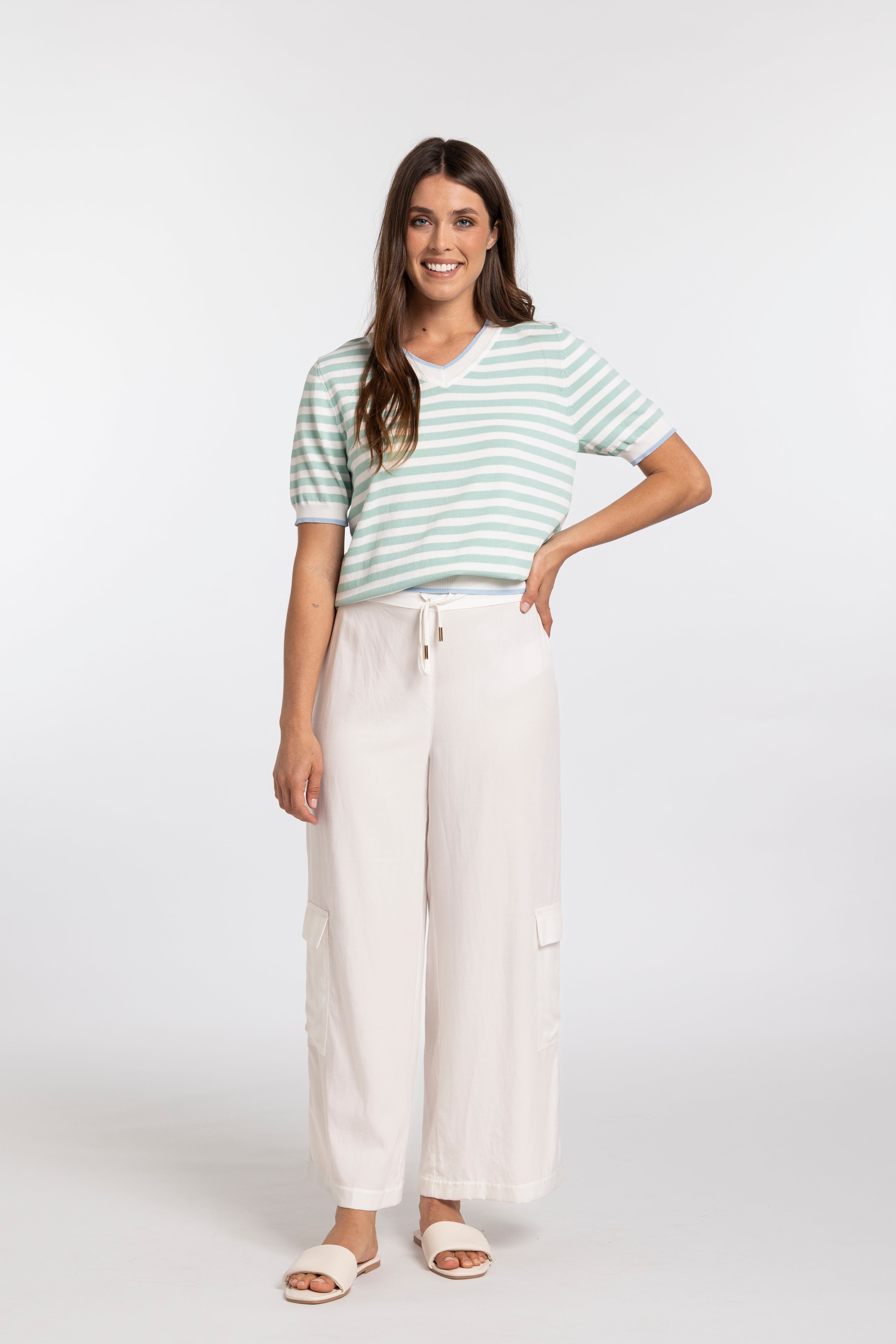 The Carla Top showcases a masterfully balanced knit construction that captures the essence of contemporary summer style. The sage, off-white, and blue colourway demonstrates sophisticated colour theory—each shade complementing the others to create visual depth without overwhelming. This piece exemplifies why quality knits have become the cornerstone of modern wardrobes, offering versatility that transcends seasons. The thoughtful palette ensures effortless coordination with existing pieces, while the knit fabrication provides the breathability and comfort essential for warmer months. A refined choice for those who understand that true style lies in understated elegance and intentional design.